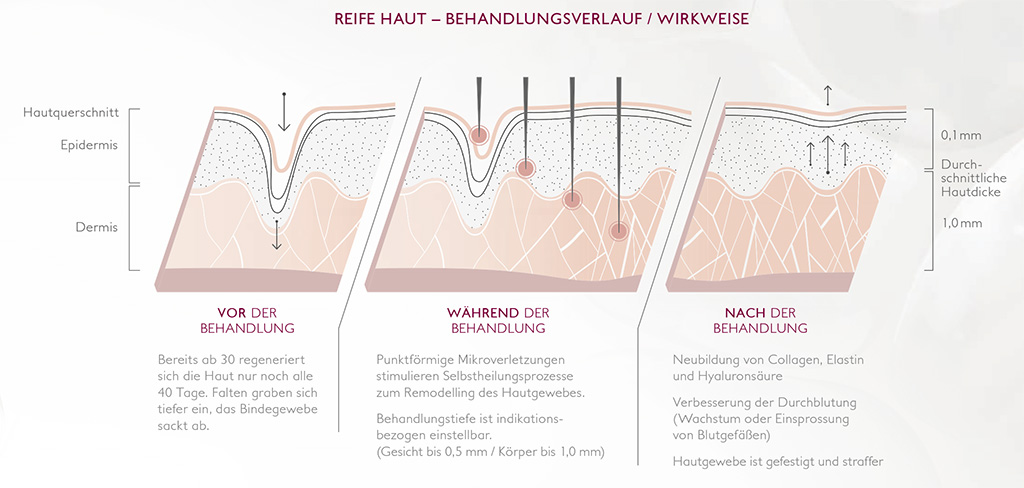 Micro-Needling nutzt die SELBSTHEILUNGSKRÄFTE DER HAUT. Punktgenau perforieren MIKROFEINE NADELN die Haut und setzen gezielt Mikroverletzungen in der Epidermis, die dieser „Wundheilung“ signalisieren. Das „müde“ Gewebe wird daraufhin sofort aktiv und setzt Prozesse in Gang, die zur Collagen- und Elastinneubildung und Hyaluronsäure-Aktivierung führen.
